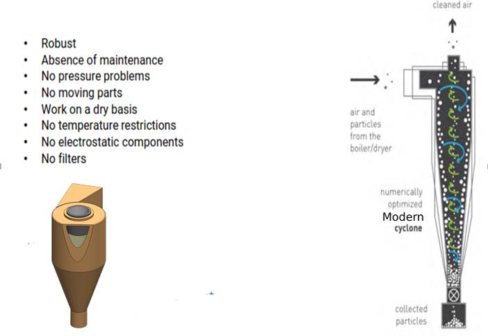Modern cyclones account for this and recent designs without any rotating parts in the high temperature zone results in higher particle collection efficiency and thus meeting even more stringent emission norms.