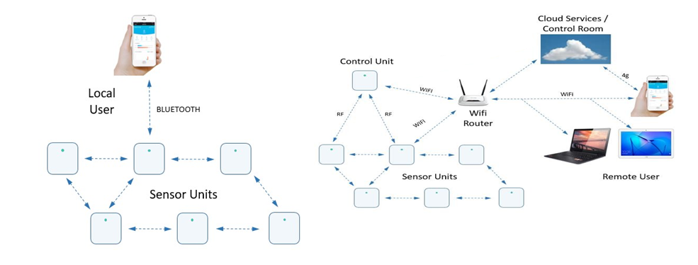 Due to efficient, wireless communication, it is easy to install sensor units and activate the system quickly. Without doubt, communication capacity is one of the key strengths of the system: sensor units, or nodes, create together a measuring network = mesh, which automatically creates and maintains data transfer connections, even if nodes were moved from a place to another. System can also be connected to a building automation system, if needed, and/or enhanced to a control system, e.g. for an air conditioning unit.