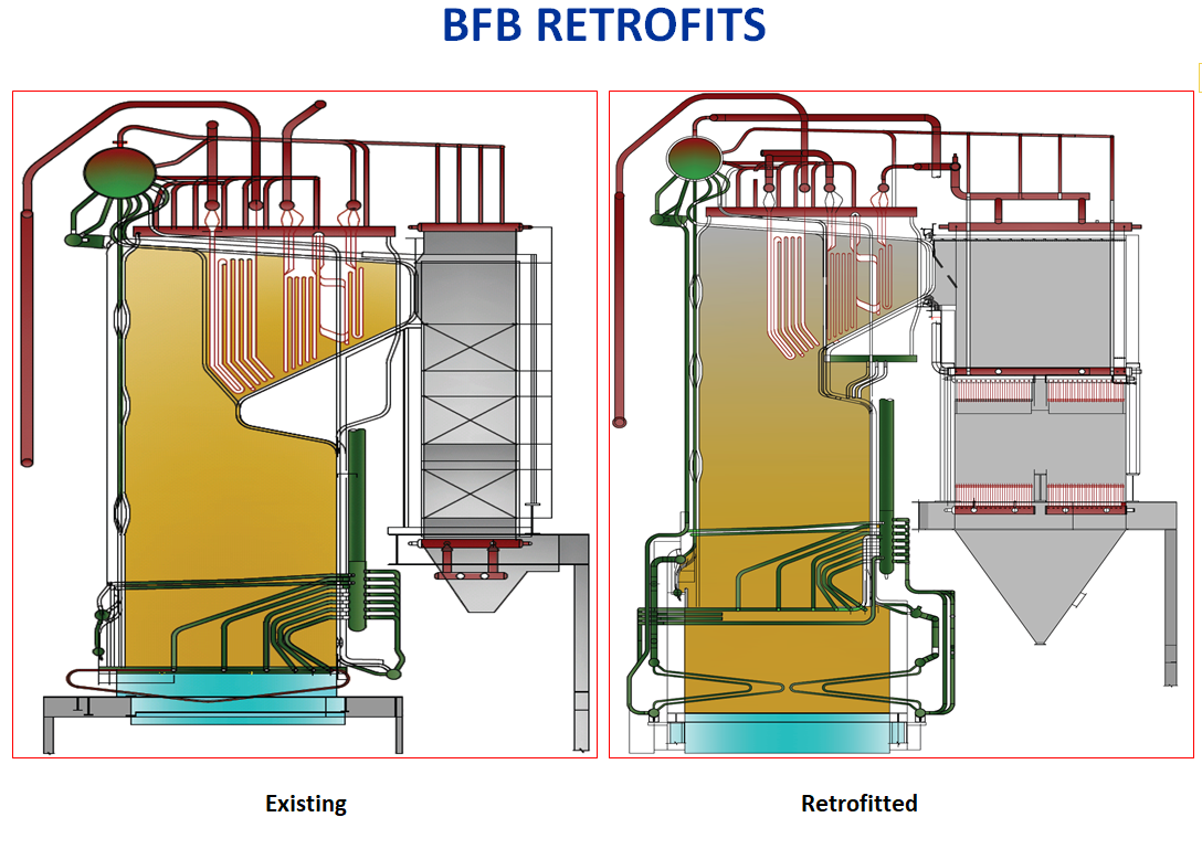 Almost all industrial units have old stoker fired boilers or old oil and gas fired boilers installed several years ago which are now inefficient either with the low grade fuels available or non-viable because of the high oil and gas prices. These old boilers can be retrofitted with BFB combustors with minimal modifications in the existing boiler’s pressure parts. By this retrofitting, not only the existing system is upgraded efficiently, but a capacity enhancement can also be achieved. AES can design and supply such BFB retrofits for any boilers without having limitations on the capacity or fuel type used.